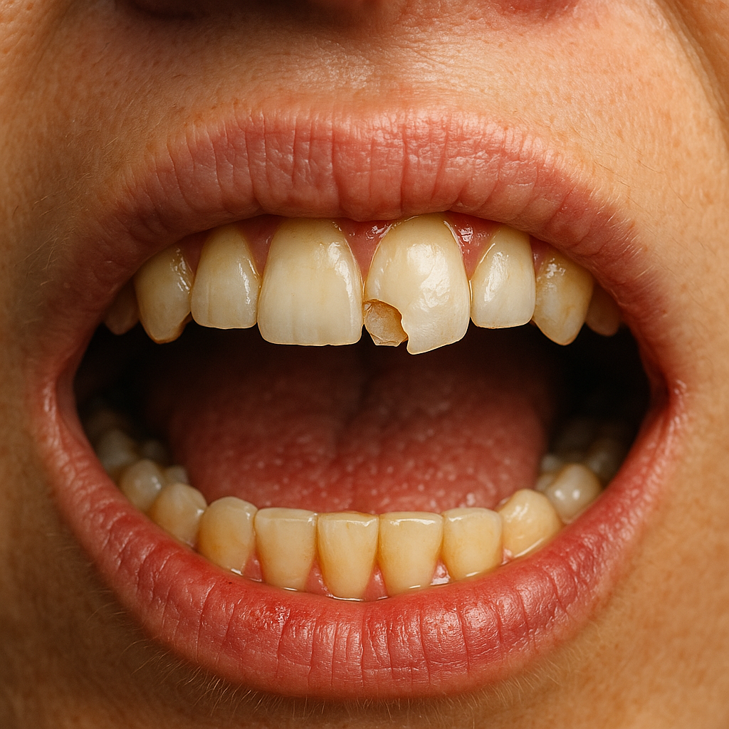 The most obvious sign of a broken tooth is a visible chip or jagged edge. Run your tongue over your teeth. Chips feel rough or sharp, sometimes catching on your cheek or tongue. Front tooth chips are easy to spot, while back tooth damage may require a